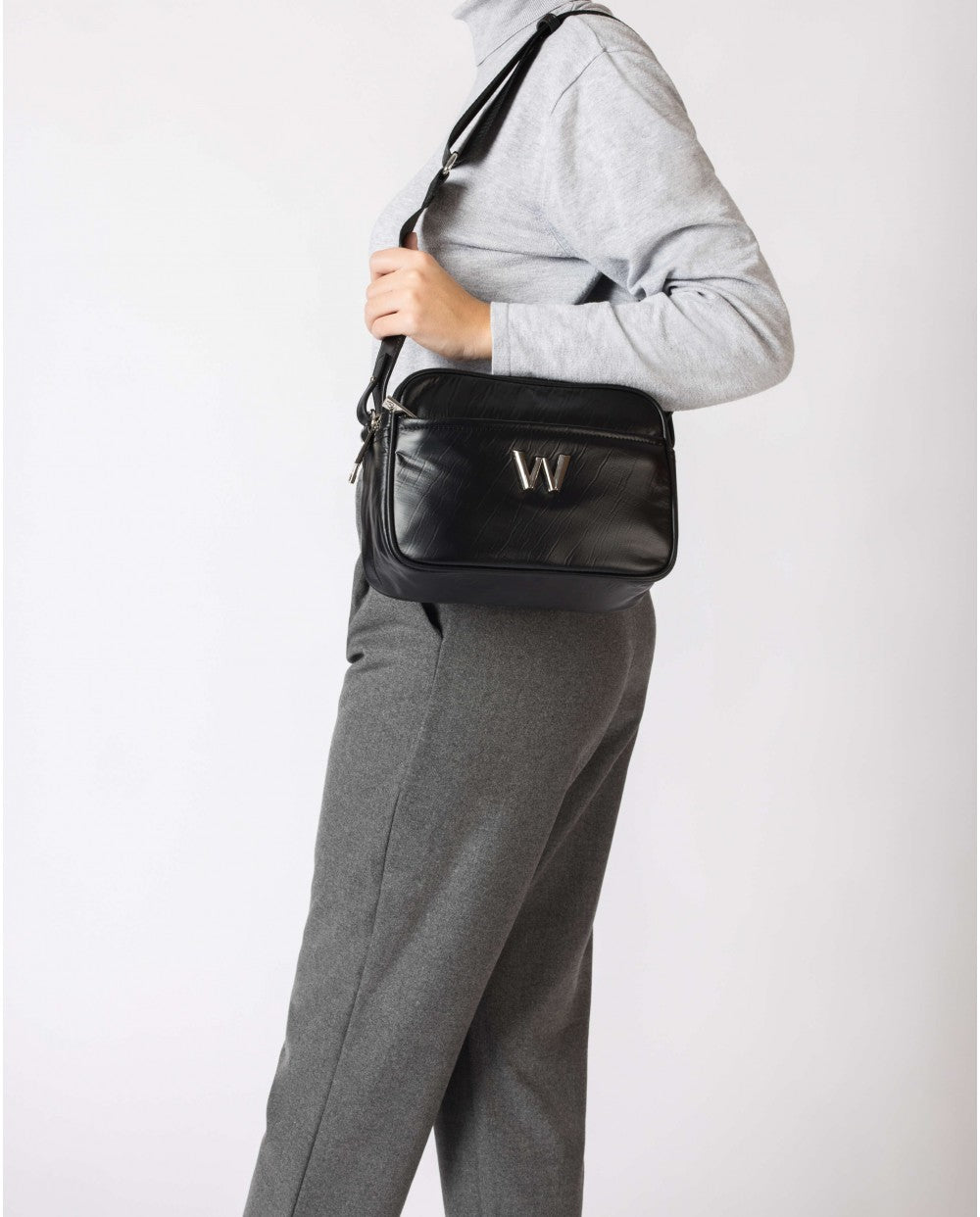 Women´s bag. This medium-sized rectangular-shaped bag has a metallic "W" detail on the front, a front pocket, a back pocket and two central pockets, all with a zip closure. With an adjustable logoed handle. The perfect complement to your Wonders shoes.